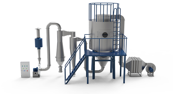 空氣通過過濾器和加熱器,進(jìn)入離心噴霧干燥器頂部的空氣分配器,熱空氣呈螺旋狀均勻進(jìn)入干燥器。料液由料液槽經(jīng)過濾器由泵送至干燥器頂部的離心霧化器,使料液噴成極小的霧狀液滴,料液和熱空氣并流接觸,水分迅速蒸發(fā),在極短時(shí)間內(nèi)干燥成成品,成品由干燥塔底部和旋風(fēng)分離器排出,廢氣由風(fēng)機(jī)排出。用戶可根據(jù)實(shí)際情況選定加熱方式和收塵、除塵方式。